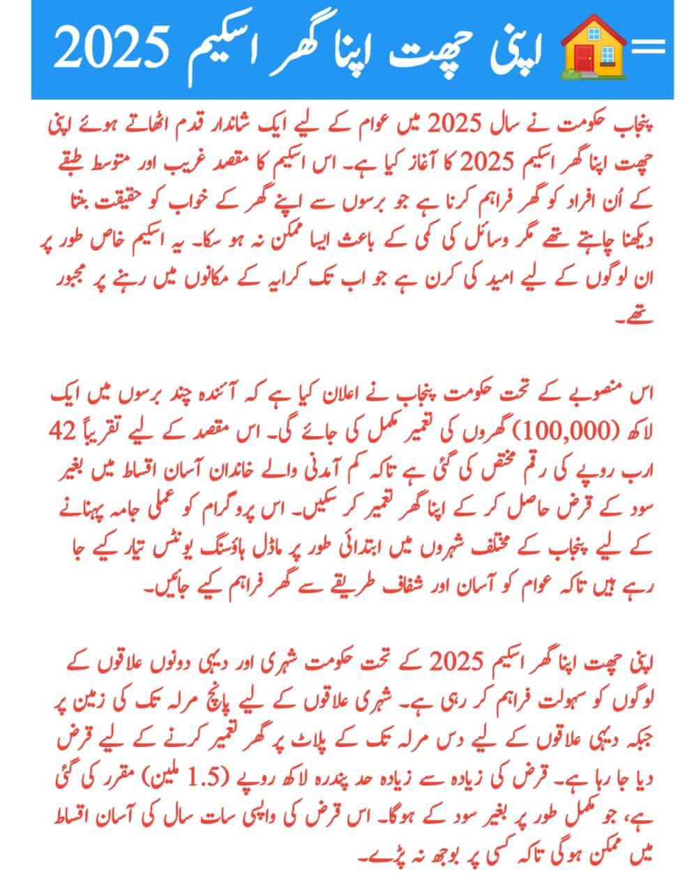 The Apni Chhat Apna Ghar Scheme 2025 is a housing project launched by the Government of Punjab to provide interest-free loans and affordable homes to people who cannot afford to build or purchase their own houses.