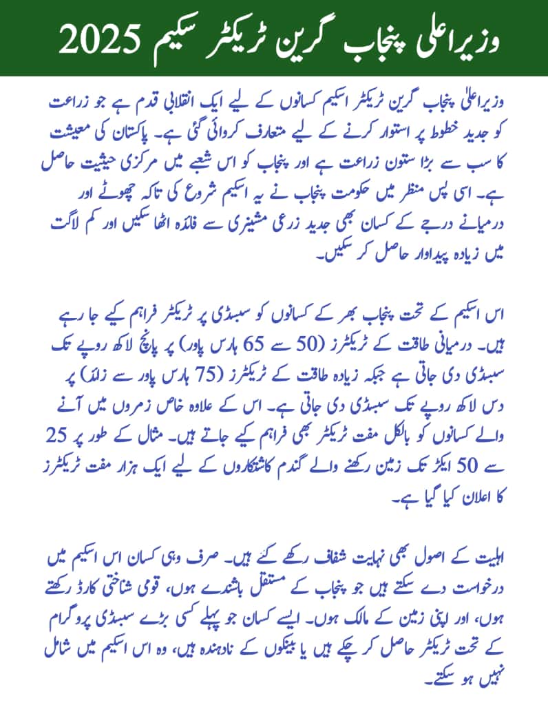 Agriculture has always been the backbone of Pakistan’s economy, and the province of Punjab plays a central role in this sector. To improve farming productivity, reduce costs, and empower small and medium farmers, the Government of Punjab has introduced the CM Punjab Green Tractor Scheme. This program offers subsidized tractors to eligible farmers, ensuring they get access to modern machinery at an affordable cost. The initiative has gained nationwide attention and is considered a revolutionary step toward strengthening the agricultural economy.